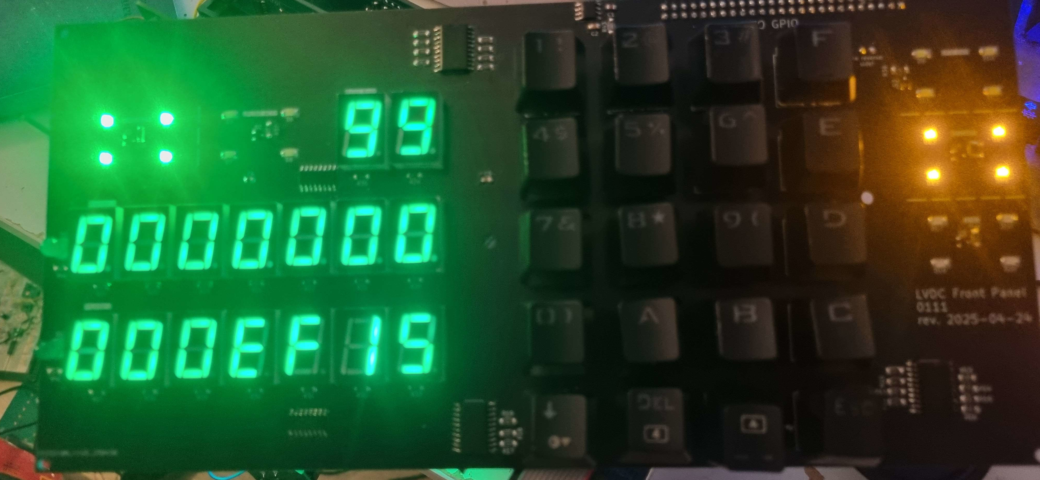 My LVDC would also not be controlling a rocket, or be embedded into something else, so a user interface for playing around with it was needed. A front panel design reminiscent of the AGC’s DSKY but shaped to fit the top of the 3D printed case is used, allowing a user to interact with the computer. This was, of course, my own invention rather than something the LVDC’s designers thought of and why I gave myself the freedom to put my own things on the I/O bus.