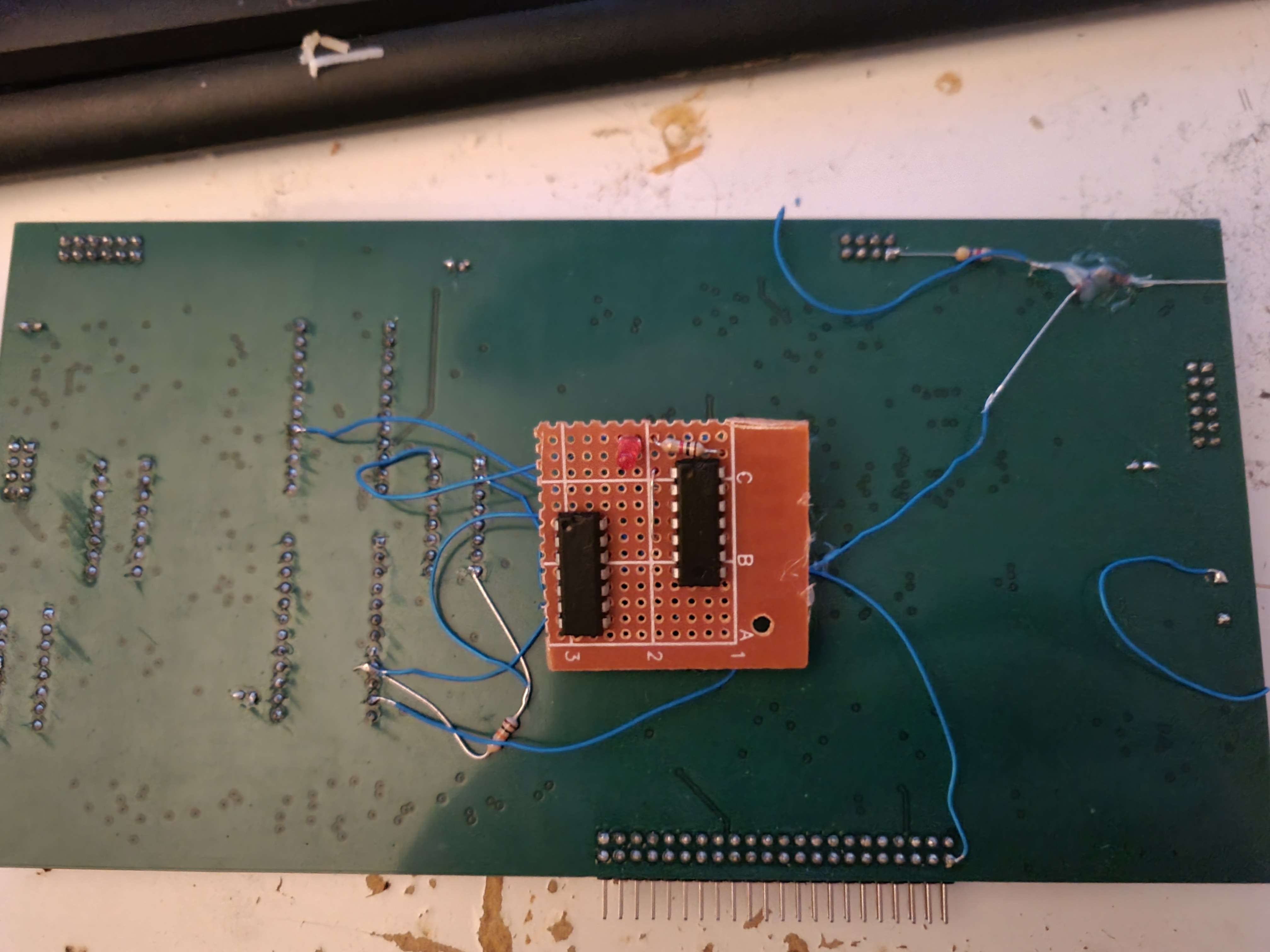 The slight bit of circuitry at the far end of the PCB is the clock buffer, another thing I translated from IC layout. Instead of every single Flip-Flop and counter in the whole system sharing one single clock line, a 74HCT04 containing 6 inverters generates 5 individual clock signals from the source clock. As all inverters are on the same IC, they should be evenly matched in delay, reducing clock skew. By giving each module its own clock source, the integrity of the clock signal is improved. The rising and falling edges are both steeper as there is less capacitance per clock line.