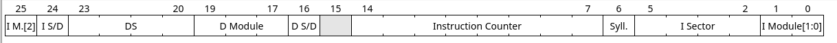 ...of which there are only two. One is the accumulator, making this machine accumulator-based and a bit more like the 6502 again, the other is "HOP". HOP is everything else you might need crammed into one. It contains the Instruction Counter, which points to the current instruction being executed, but also the desired sector and module selection. The sector and module for data accesses is specified separately from the sector and module for instruction accesses, which makes absolute addressing of the entire memory possible. The data sector/module selection can be updated independently of the rest of HOP at any time and without having to branch to a specific module or sector. Of note is that the Instruction Counter overflowing does not increment the instruction sector selector. Instead, the whole HOP register must be loaded with a new value to branch to a different module and sector, which also sets up the initial data sector/module AND selected instruction syllable (also stored in HOP) AND desired memory "mode" all at once.