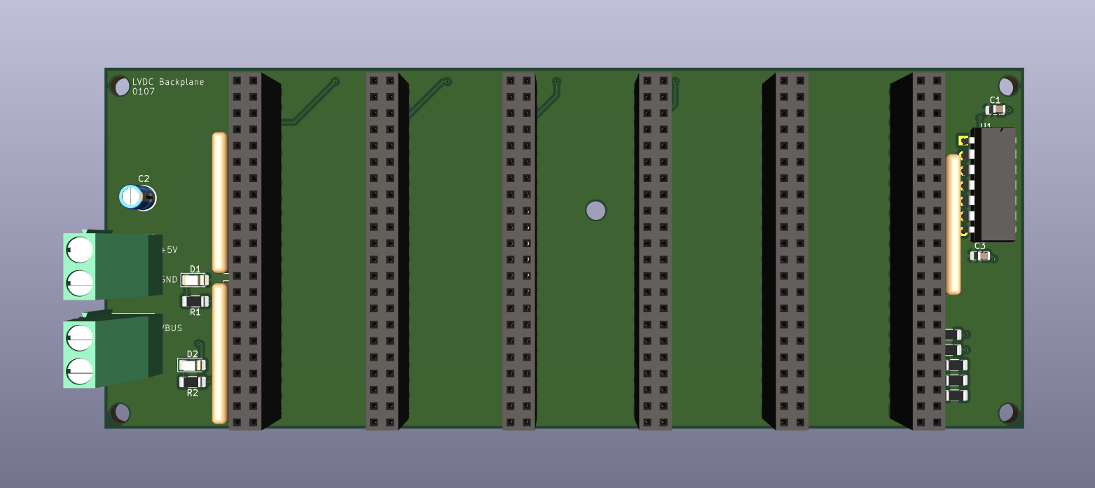Only the most common signals are carried through the backplane. Signals that only need to travel between two specific modules are carried via ribbon cables between the modules involved. To improve bus speeds, any signals that travel through the backplane may be run at a higher voltage than the rest of the system, with buffers on each module boosting or lowering the voltage of these signals, thus the two screw terminals for power input. In my final system configuration, I ended up running both from the same +5V supply, though.