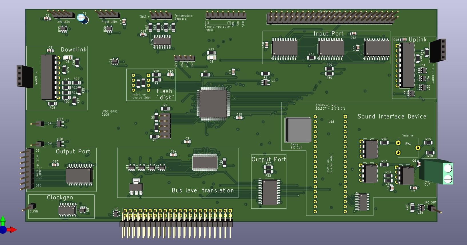 This board is where things go off the rails as its where I could put all of my custom peripheral choices without being restrained to historical accuracy. To drive this point home, the center of this board is a modern-ish CPLD, which mostly just generates control signals to the other peripherals, but itself contains an SPI port, system timer and front panel driver. The actual peripherals are pretty diverse, starting with simple digital input and output ports, followed by a radio transciever based on the HT12E/HT12D chips, a header to connect addressable LED strips to and a whole Commodore 64 SID chip in the form of my GFMPW-1 custom silicon.