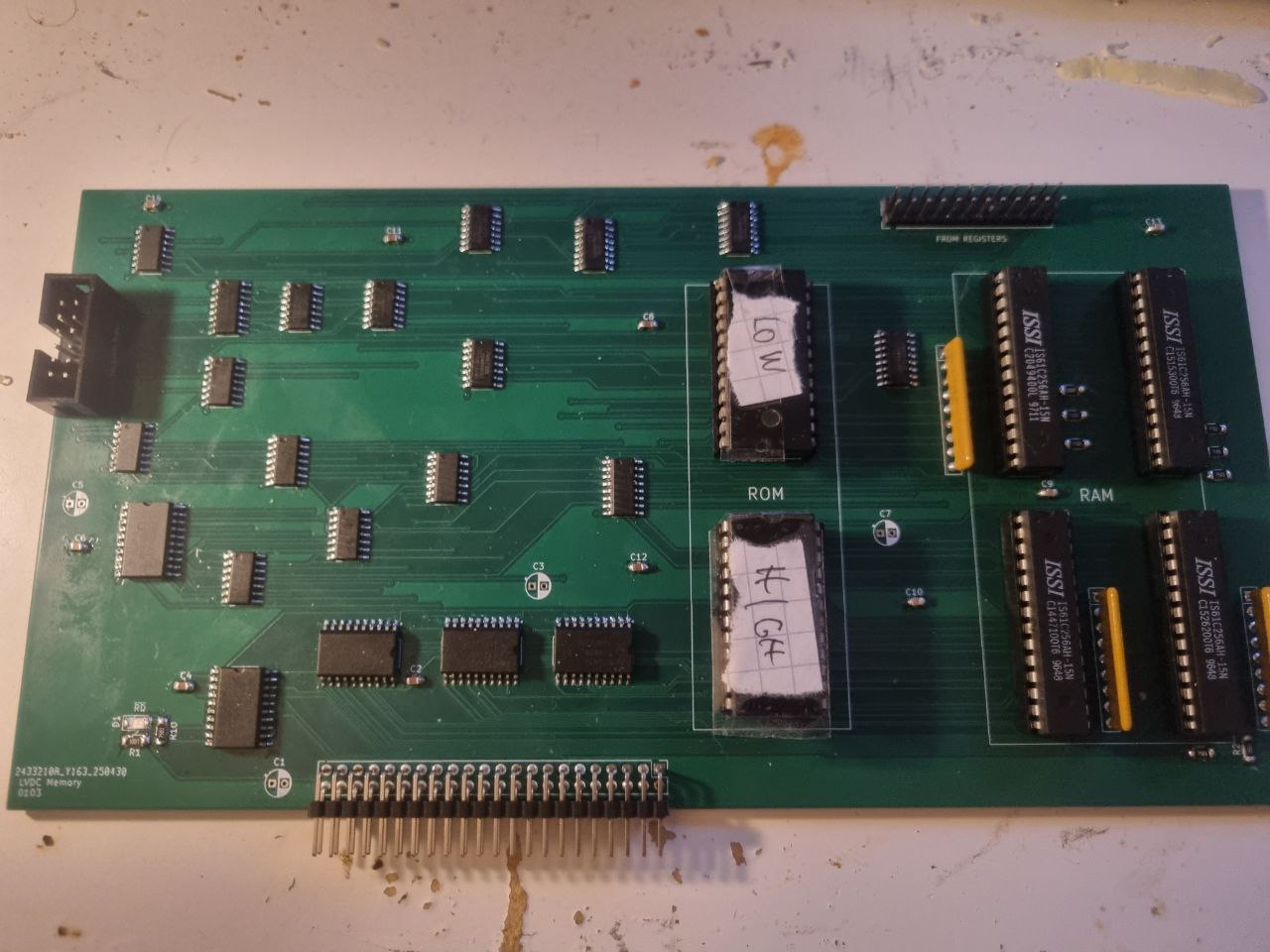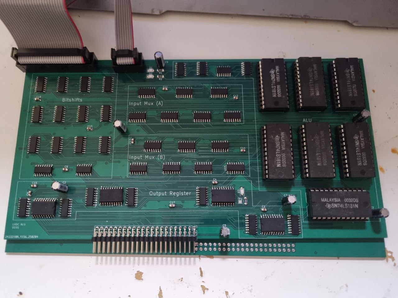 This was the first PCB I designed for the project. At its heart is a heap of 74LS181 ALUs, of which 7 are required to implement a full 26-bit ALU. All operations except for bitshifts are implemented through these. For shifts, a heap of 4-to-1 multiplexers select between the four possible shifts, which is a bit brute-force, but works. Conveniently, the multiplexers output a constant zero if their enable line is deasserted, providing the accumulator clear operation. Annoyingly, RSU exists, which is the same as SUB, but swaps the inputs around. The 74LS181s do not provide this, so the only way to implement this on this PCB so far is it to buffer both ALU inputs through 2-to-1 multiplexers to allow them to be conditionally swapped. That is 14 extra chips for all 26-bits, just for one instruction. Since one ALU input is the bus contents and the other is the accumulator, the result of the ALU computation needs to be latched and held until the ALU gets its turn to put this data onto the bus. A final set of multiplexers selects between 74LS181 and shifter outputs and this is then clocked into a set of D-Flip-Flops, which hold this data for just one clock cycle. But this is enough for the ALU output to be transfered over the bus.