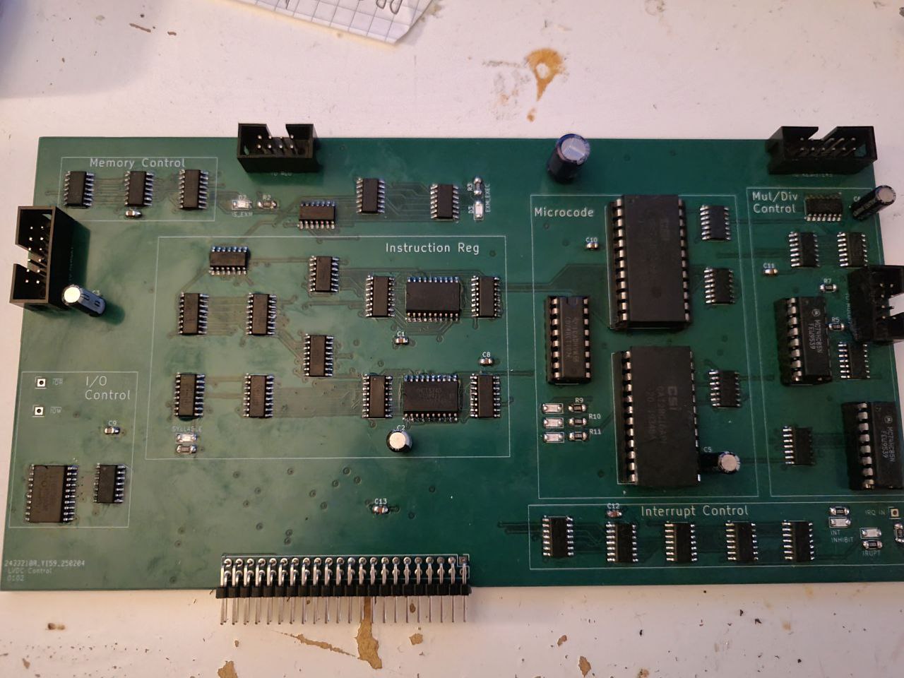 The control board ties everything together, containing the instruction decode unit generating all the control signals, as well as handling interrupts. The system is microcoded through two 2KiB EEPROMs which take in the instruction opcode from the Instruction Register (also on this board) as well as relevant instruction argument bits and the value of the 3-bit instruction cycle counter. Instructions can complete in varying amounts of time as there is a control signal to reset the cycle counter and fetch the next instruction. The shortest instructions complete in 3 clocks while the longest single instructions complete after 6 clock cycles, those being DIV and MPY. Most instructions complete after 4 clocks. Technically, MPH and EXM compete for longest instruction, but the former only as it halts the processor entirely until the multiplication is complete and the latter only because it triggers the out-of-order execution of another instruction. The maximum clock speed appears to be around 2.5MHz.