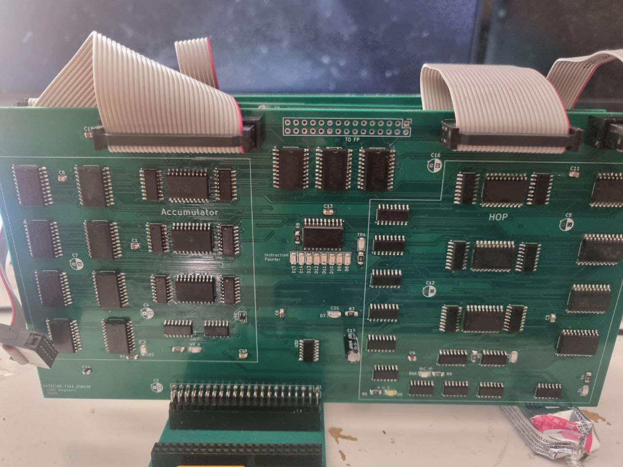The accumulator value is actually exposed on a pin header labeled "TO FP" (to Front Panel) for display, but this later went unused. It is of note, though, that whenever things are exposed like this or wired to LEDs, it is always done through buffers. No LEDs or testpoints are wired directly to lines that also wire to logic inputs, to preserve signal transition times and noise margins.