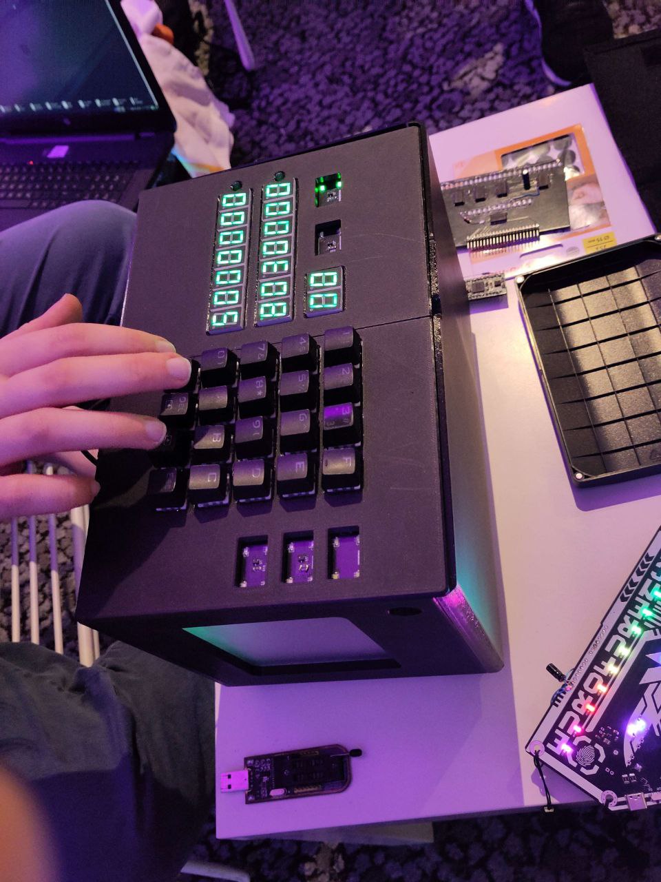 The case for the computer is 3D printed, but unfortunately each of the longer panels consists of two pieces as the whole thing ended up too wide, so it likes to fall appart. Not seen here is the fan mounted at the bottom of the case. To make matters worse, I do not own a 3D printer of my own and so instead I organized the printing be done by someone else, with us meeting at a convention and assembling everything in a comfy corner somewhere, hoping it all fits first-try. Luckily, it did, but I barely made it home with the case still in one piece. Not seen here is a later addition of an addressable LED strip controlled by the CPU which wrapps its way around both the inside and the outside of the case.