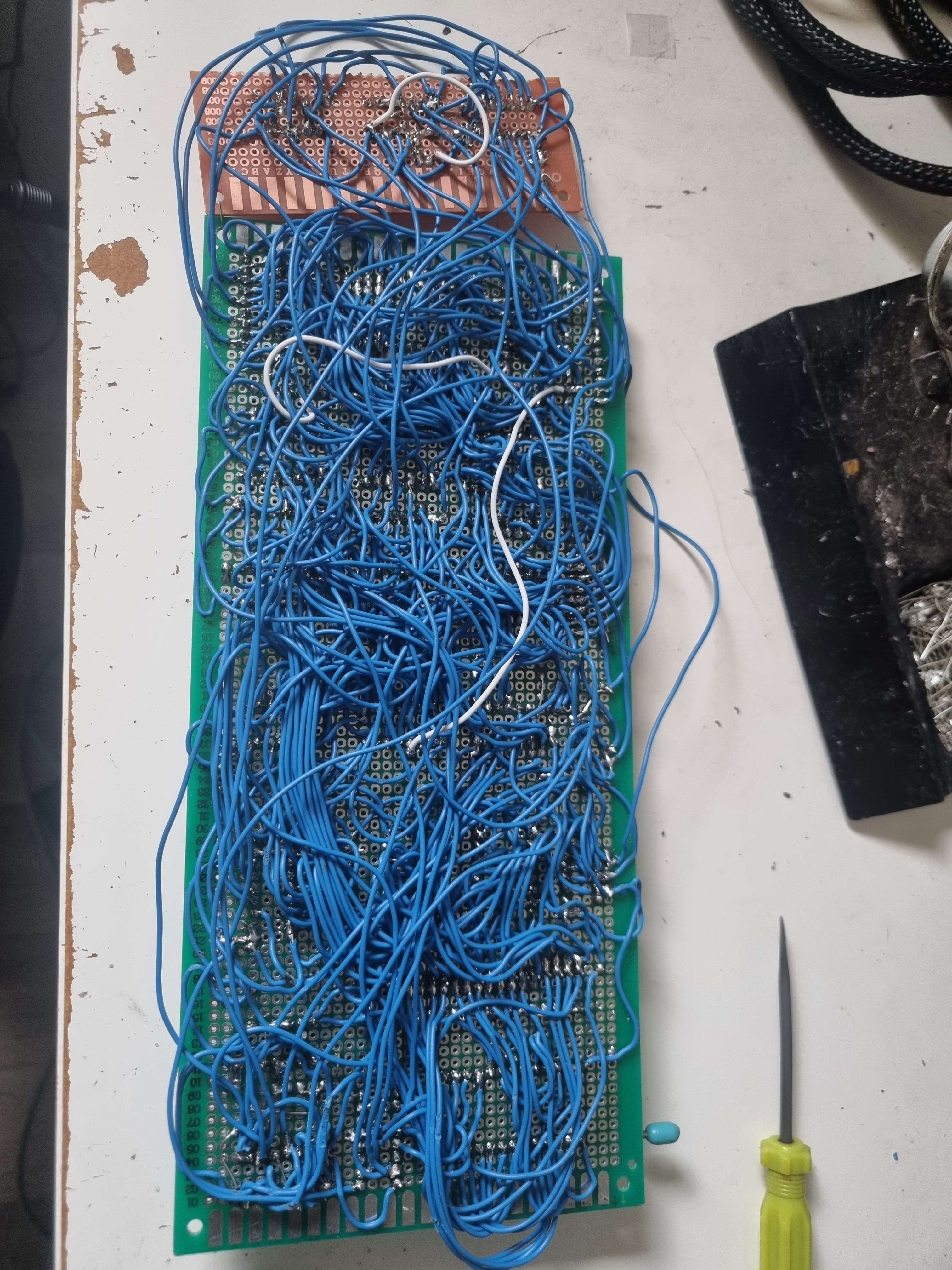 In the end, this design comes out to very little ICs even compared to those bit serial TTL minicomputers. Though I do end up running out of board space at one point and have to extend the perfboard a little. Still, the density of this design could probably be perfected even more by using actual PCBs (something I should’ve done instead of suffering through manually wiring